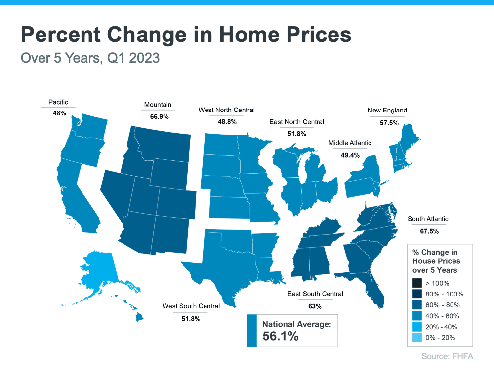 If you look at the percent change in home prices, you can see home prices grew on average by just over 56% nationwide over a five-year period.